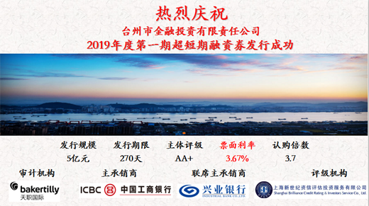 5月13日,市金投集團成功發行2019年度第一期超短期融資券5億元,主體評級AA+,期限270日,全場認購倍數3.7倍,債券票面利率3.67%,利率在同期發行的城投類公司中處于較低水平。超短融的成功發行,不僅在改善公司整體債務結構、降低融資成本等方面意義重大,也為公司壓實有息負債、防范融資風險、健康發展保駕護航。