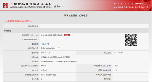 臺(tái)州市金控基金管理有限公司已于日前通過了中國(guó)證券投資基金業(yè)協(xié)會(huì)私募基金管理人登記,登記編號(hào):P1061574。