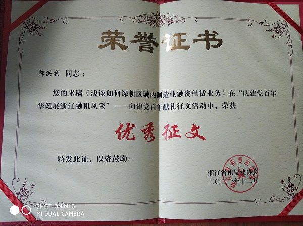 同時,浙江臺金融資租賃有限公司選送參加“慶建黨百年華誕展浙江融租風(fēng)采”向建黨百年獻禮征文活動的文章——《淺談如何深耕區(qū)域內(nèi)制造業(yè)融資租賃業(yè)務(wù)》,在各類選送作品中脫穎而出,入選“優(yōu)秀征文”名單。