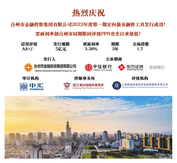 5月30日,臺(tái)州市金融投資集團(tuán)有限公司(以下簡(jiǎn)稱市金投集團(tuán))首單非公開(kāi)定向債務(wù)融資工具(PPN)成功發(fā)行。發(fā)行金額5億元,期限3年,票面利率3.38%,由中信銀行與東方證券聯(lián)合承銷,全場(chǎng)認(rèn)購(gòu)倍數(shù)1.7倍。市金投集團(tuán)持續(xù)關(guān)注市場(chǎng)動(dòng)態(tài),緊抓央行降準(zhǔn)和貸幣政策寬松窗口,在各中介機(jī)構(gòu)的支持和市場(chǎng)投資者的高度認(rèn)可下,本次PPN票面利率創(chuàng)臺(tái)州市同期限同評(píng)級(jí)PPN有史以來(lái)最低。