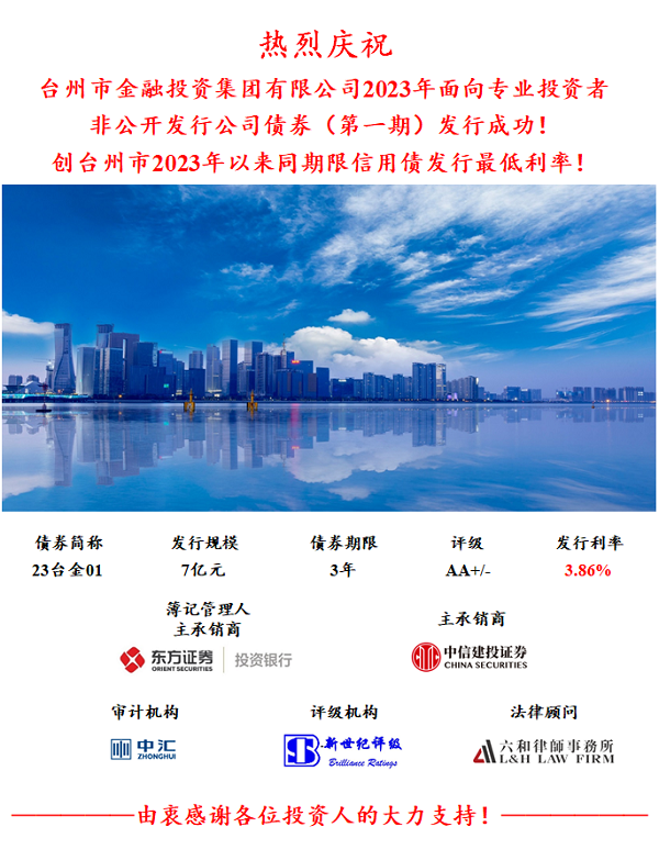 2023年4月11日,臺州市金融投資集團有限公司(以下簡稱市金投集團)面向專業(yè)投資者第一期非公開發(fā)行公司債券(私募公司債)發(fā)行成功,揭開了市金投集團2023年發(fā)債的序幕。