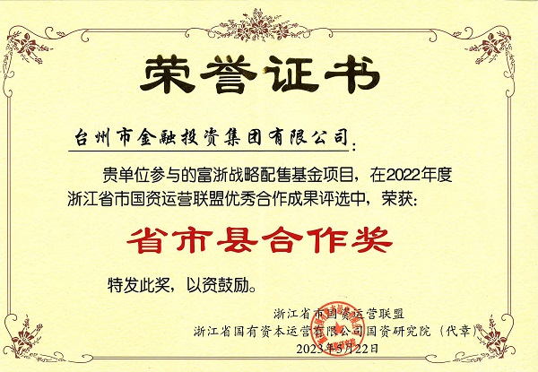 近日,市金投集團參與的富浙戰配基金項目,在2022年度浙江省市國資運營聯盟優秀合作成果評選中,榮獲“省市縣合作獎”。