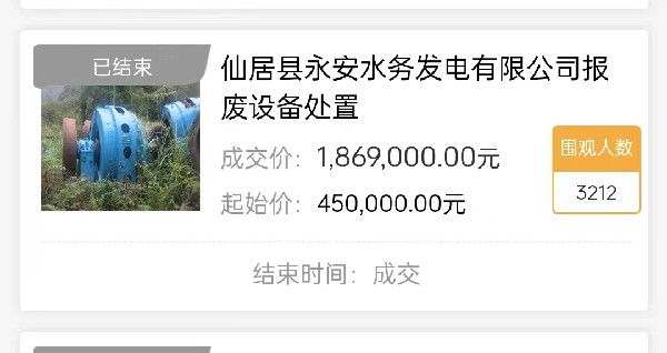 自統一全市國有資產公開交易平臺以來,11月20日,仙居首宗項目——仙居縣永安水務發電有限公司報廢設備處置成功高溢價成交。該項目起拍價45萬元,經573輪次競價,最終成交價186.9萬元,溢價率高達315.33%,創下2023年以來新高。
