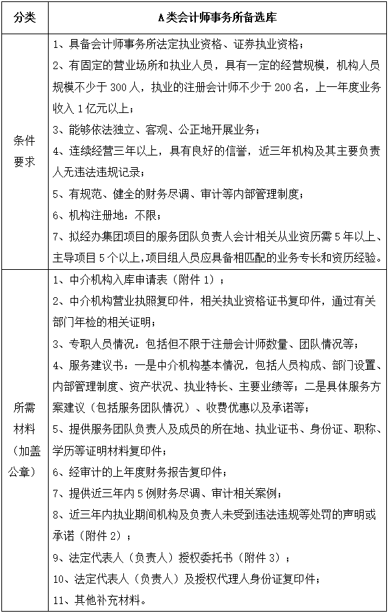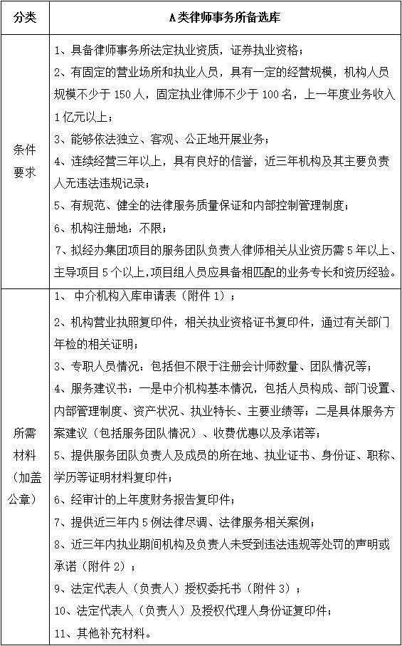 為更好的滿足集團財務審計、財務盡調、法律服務、法律咨詢等專業服務需求,集團擬對會計師事務所、律師事務所備選庫開展中介機構入庫申報選聘工作,現將有關事項公告如下: