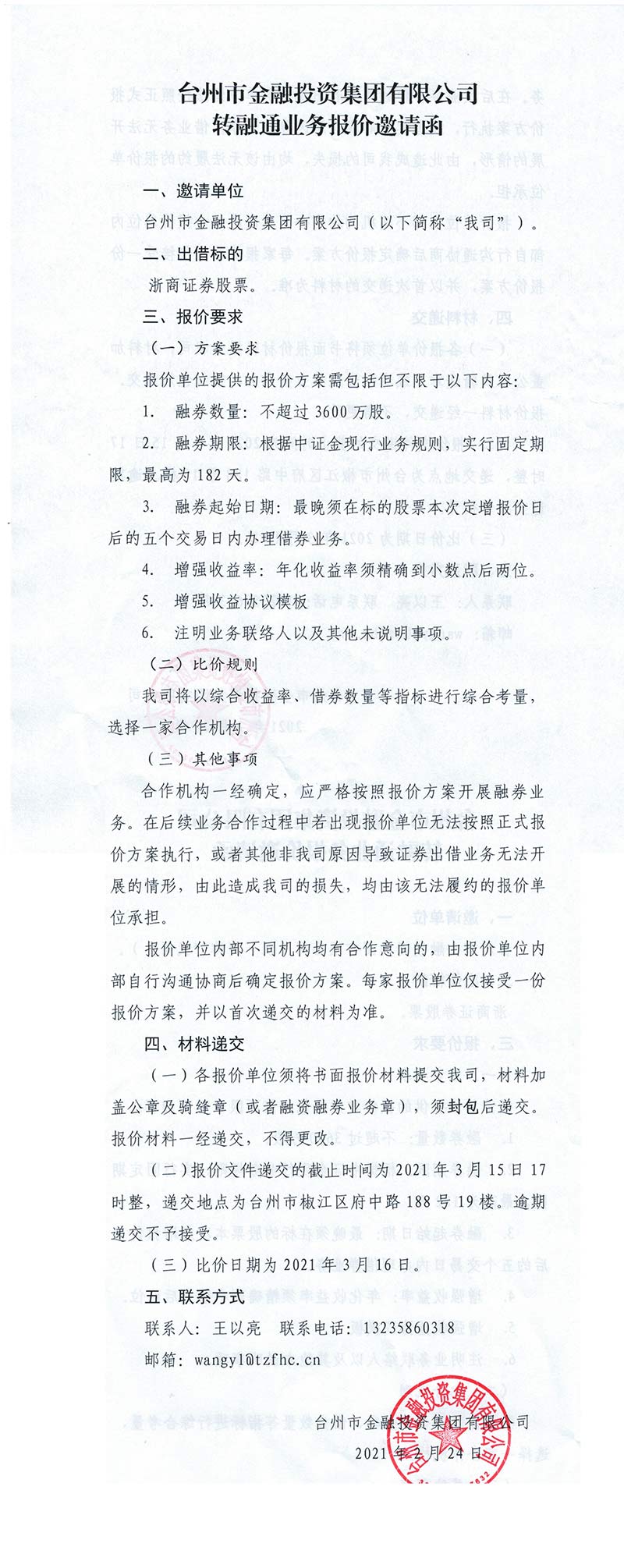 臺州市金融投資集團轉融通業務報價邀請函(浙商證券股票報價)