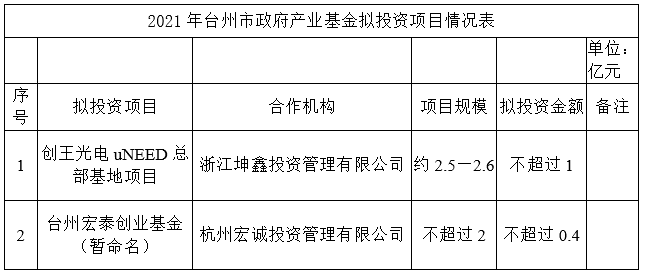 根據《臺州市政府產業基金管理辦法》 (臺財企發〔2021〕6號)等有關規定,為發揮政府產業基金引領作用,臺州市政府產業基金擬投資的2個項目(含1個定向基金),已由臺州市金融投資集團有限公司決策委員會(基金管理委員會)審議通過,現將所有擬投資項目予以公示。如有意見,可向市金投集團反映。