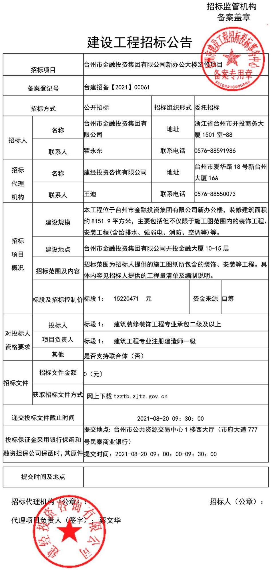 臺州市金融投資集團有限公司新辦公大樓裝修項目招標公告