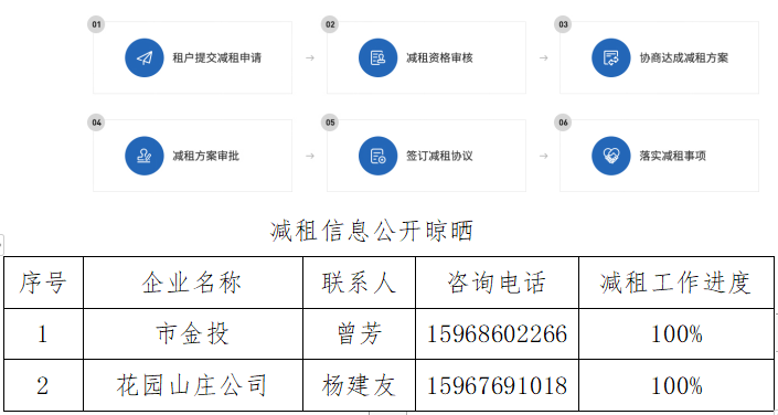 截至2022年6月5日,市金投集團應減租金78.75萬元,涉及承租戶1戶,其中持股企業臺州市政府花園招待所有限公司應減租金78.75萬元,涉及承租戶1戶;臺州市政府花園招待所有限公司已減租金78.75萬元,占應減租金的100%,已減租1戶,占應減承租戶的100%;其中,民營企業應減房租78.75萬元,涉及承租戶1戶,實際已減租金78.75萬元,已減租1戶;個體工商戶及個人應減房租0元,涉及承租戶0戶。