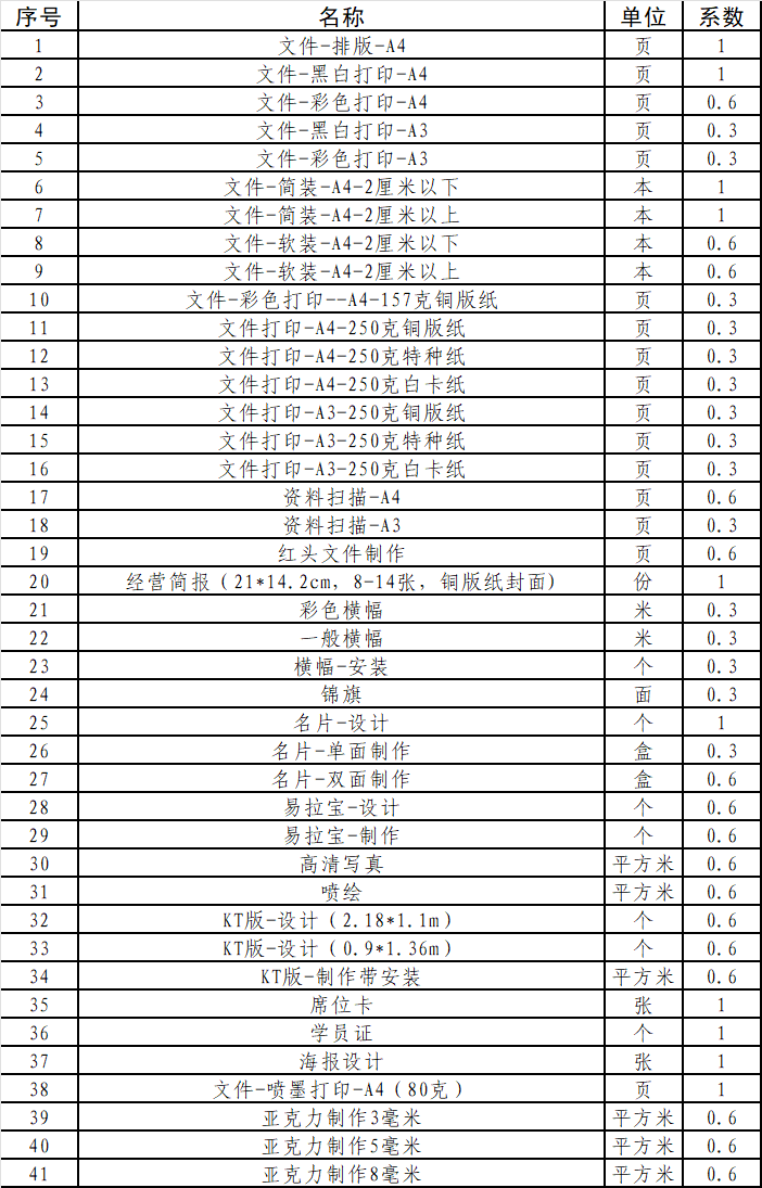 1.采購內容:選擇一家文印服務商簽訂服務協議,原則上服務期限不超過2年,每年續簽一次,若出現服務不到位的情況,公司有權重新采購或終止服務。文印服務包括但不限于下列清單。