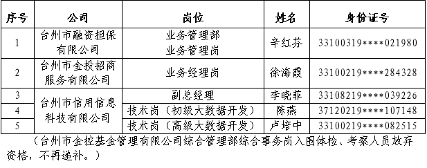 根據2023年6月16日發(fā)布的《臺州市金融投資集團有限公司所屬企業(yè)2023年夏季招聘公告》要求,經公開報名、面試、體檢和考察等程序,確定以下人員為擬錄用人員,現公示如下: